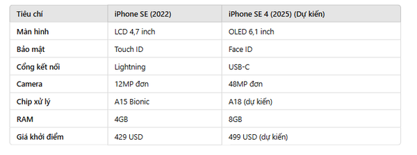 Dưới đây là bảng so sánh nhanh giữa iPhone SE 4 và phiên bản hiện tại: