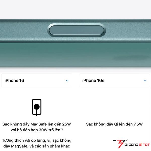 iPhone 16 hỗ trợ sạc không dây MagSafe & Qi2 (15W), trong khi iPhone 16e chỉ hỗ trợ Qi (7.5W).