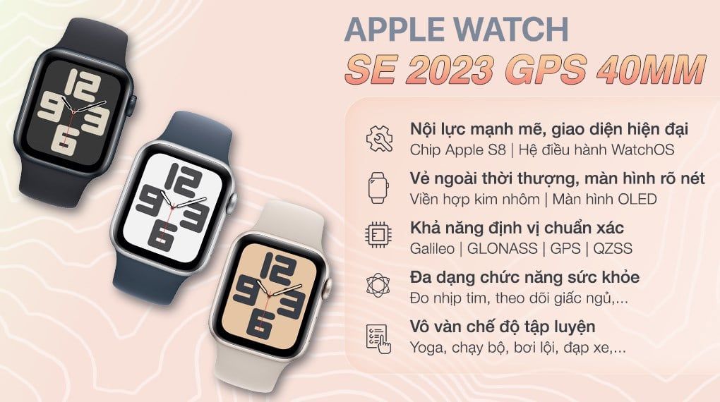 Apple Watch SE 2023 GPS 40mm viền nhôm dây thể thao là chiếc smartwatch có mức giá dễ tiếp cận nhất nhà Táo, là lựa chọn tối ưu ngân sách cho người dùng nhưng vẫn đảm bảo một thiết kế đẹp mắt, hỗ trợ đa dạng tính năng cũng như tiện ích hằng ngày.