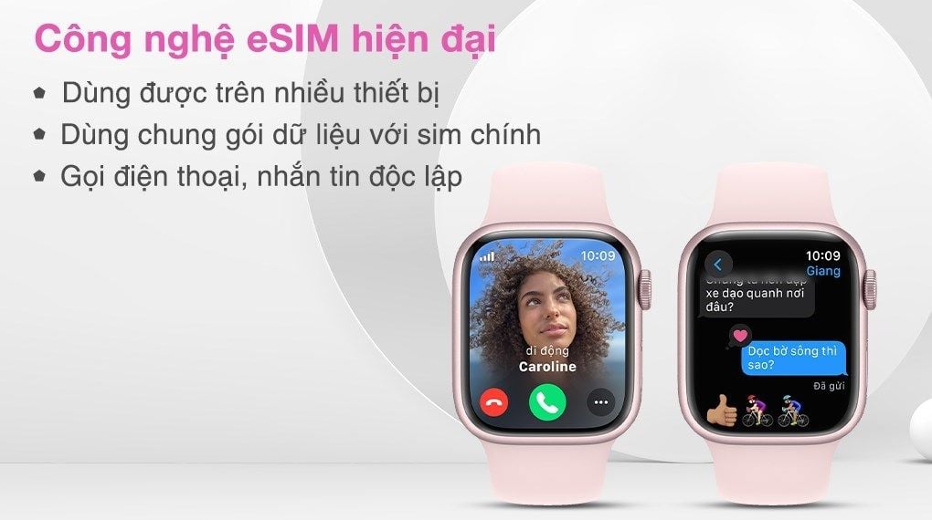 Apple Watch không chỉ hỗ trợ trả lời tin nhắn, nhận thông báo từ ứng dụng mà bạn còn có thể nghe gọi thông qua eSIM, một tính năng mang đến sự tiện lợi cho bạn trong những lúc bận rộn hoặc khi bỏ quên điện thoại ở nhà, khi đang trên đường đến trường học, công ty,...