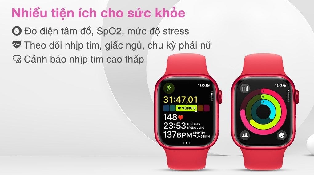 Với đa dạng cảm biến được hỗ trợ trên Apple Watch Series 9, bạn có thể xem nhanh và chi tiết những chỉ số về sức khỏe như điện tâm đồ, nồng độ oxy trong máu (SpO2), theo dõi chu kỳ kinh nguyệt, dự đoán ngày rụng trứng, nhận thông báo khi nhịp tim cao/thấp, không đều,...