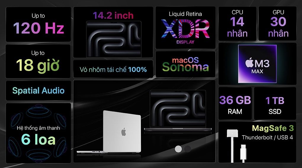 | Bộ xử lý | • Chip Apple M3 Max | • Chip Apple M3 Pro | • Chip Apple M3 | • Chip Apple M3 Pro | • Chip Apple M3 Max |