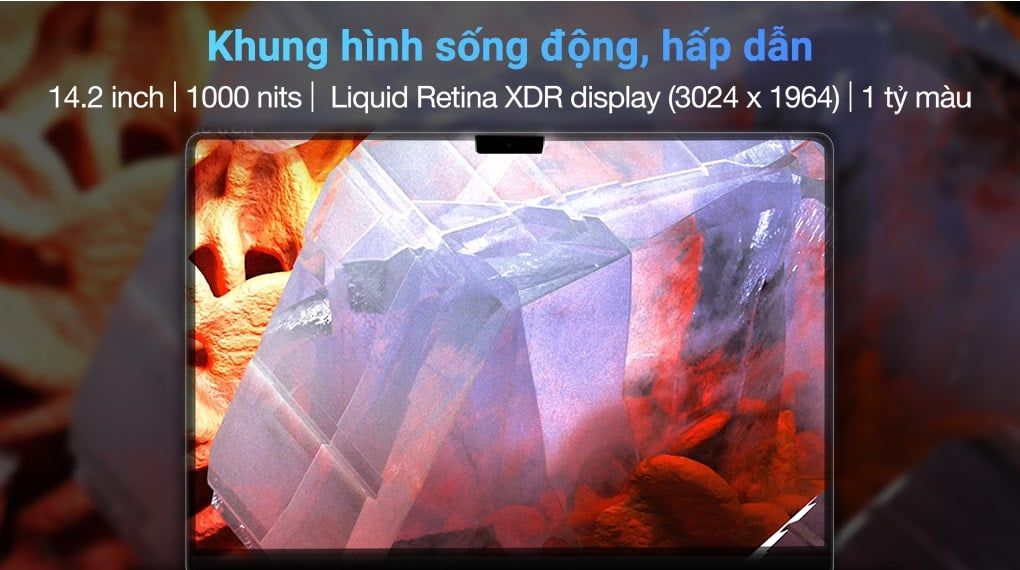Macbook được trang bị màn hình Liquid Retina XDR có kích thước 14.2 inch đi cùng độ phân giải gốc 3024 x 1964 mang đến những điểm chất lượng hình ảnh cao, khiến cho cảm quan màu sắc của người dùng bị thu hút và hấp dẫn hơn.
