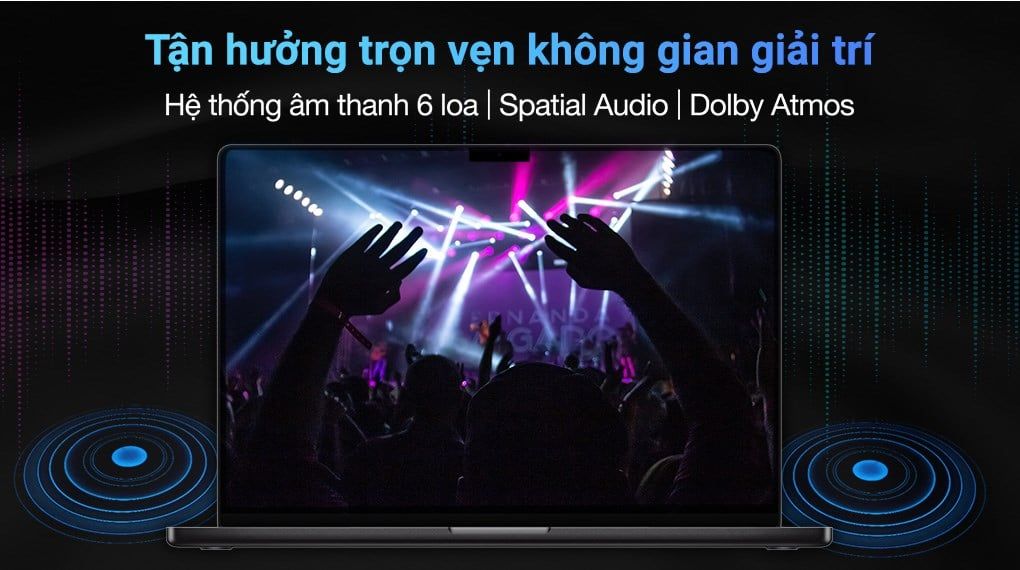 MacBook Pro M3 Max sử dụng hệ thống âm thanh đỉnh cao với 6 loa tích hợp cùng các công nghệ 3D như: Spatial Audio, Dolby Atmos khiến cho âm sắc có độ trong cao, to rõ và như bao quanh thính giác người dùng. Bạn có thể tự tin trải nghiệm âm nhạc, phim ảnh một cách đắm chìm nhất mà không cần thiết phải kết nối với loa bên ngoài.