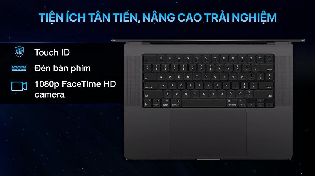 Bàn phím của MacBook Pro 16 inch M3 Pro 2023 với tone màu đen sang trọng, đi kèm với hàng phím chức năng có chiều cao đầy đủ và tích hợp Touch ID giúp bạn mở khóa máy tính một cách nhanh chóng chỉ với một lần chạm, cho phép bạn mở khóa máy tính, xác thực tài khoản và thực hiện các giao dịch một cách an toàn bằng bảo mật vân tay. Không chỉ giúp tiết kiệm thời gian đăng nhập, tính năng này còn đảm bảo độ an toàn cao hơn cho dữ liệu bên trong so với việc sử dụng mật khẩu truyền thống. Máy cũng có đèn nền bàn phím cho người dùng làm việc trong môi trường tối tốt hơn.
