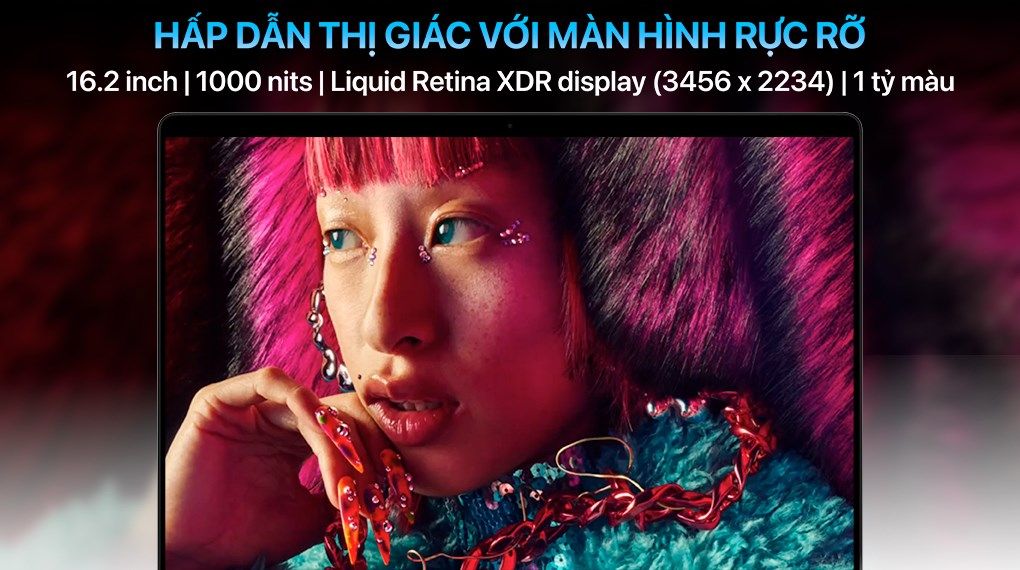 Màn hình laptop rộng 16.2 inch với độ phân giải Liquid Retina XDR display (3546 x 2234) không chỉ mang đến độ sáng liên tục lên đến 1000 nits cho XDR, mà còn có khả năng đạt tới độ sáng tối đa 1600 nits cho nội dung HDR, tạo nên một trải nghiệm xem ảnh và video tuyệt vời. Tỷ lệ tương phản cao giữa ánh sáng và bóng tối giúp hình ảnh trở nên sắc nét và sống động hơn bao giờ hết.