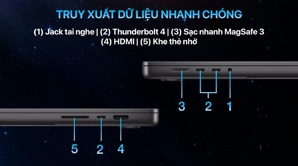 | Cổng kết nối | • Ba cổng Thunderbolt 4 (USB-C) • Cổng HDMI • Khe thẻ nhớ SDXC | • Ba cổng Thunderbolt 4 (USB-C) • Cổng HDMI • Khe thẻ nhớ SDXC | • Hai cổng Thunderbolt / USB 4 (USB-C) • Cổng HDMI • Khe thẻ nhớ SDXC | • Ba cổng Thunderbolt 4 (USB-C) • Cổng HDMI • Khe thẻ nhớ SDXC | • Ba cổng Thunderbolt 4 (USB-C) • Cổng HDMI • Khe thẻ nhớ SDXC |